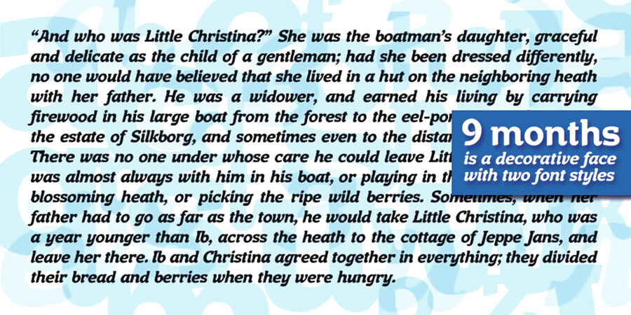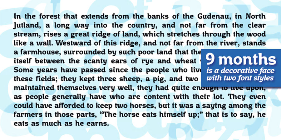 9 months — декоративний шрифт із двома накресленнями. Він гарно виглядатиме на упаковках для їжі, особливо, солодощів, у дитячих книжках і журналах.