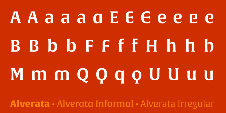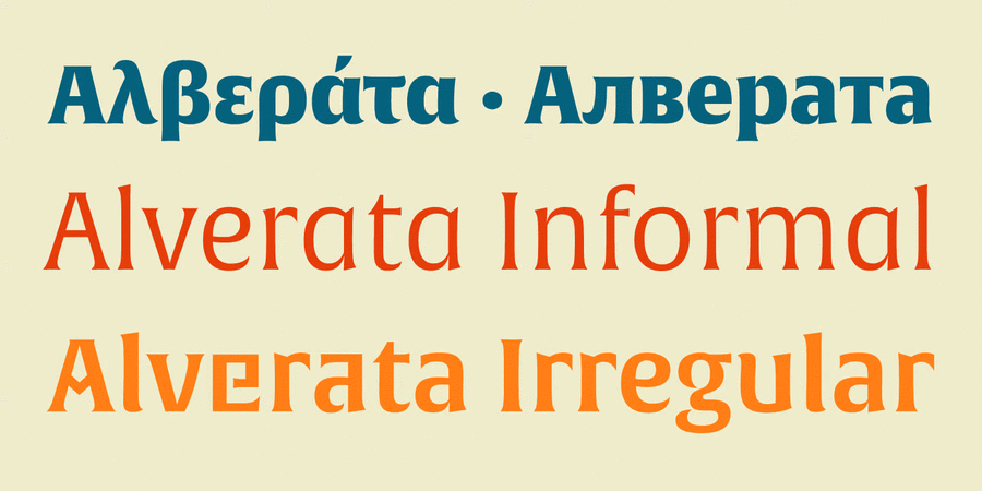 Alverata Cyrillic – це сучасна електична шрифтова родина, натхненна шрифтовими формами середньовічної Європи. Основою цього шрифту є капітальний лист, вплив якого можна побачити в його коротких засічках шиповидних і розкльошених штрихах. Alverata також експериментує з самими графемами, змінюючи прямі лінії на криві та навпаки. Гарнітура чудово справляється як із цифровим, так і з фізичним застосуванням, забезпечуючи відмінну відкритість та розбірливість дрібного тексту, а також жвавість та привабливість при великих розмірах. Нагороди та відзнаки: ISTD 2014, Typeface Design 2014, Communication Arts, Рутенія 2014, Fontshop’s Best of 2014, Typographica’s Notable Releases of 2014, 2015 European Design Gold Award, Honourable mention in Print Magazine, 2015 Yearbook of Type II, TDC Tokio: Type Design Prize 2016, 50 best typefaces in étapes magazine 2014. Гарнітуру розробив Герард Унґер у 2014 році.