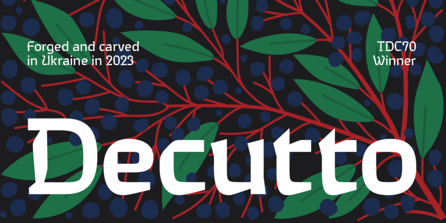 Decutto — це нео-гротеск, що бере маріонеткову формулу та деякі ідеї готичного письма та запаковує їх в малоконтрастний беззасічковий дизайн. Шрифт має відзнаку TDC Certificate of Typographic Excellence. Його назва грає виразами “off cut” і “cut to”, які виражають його ключову особливість — сучасна легкочитабельна форма літер декорована прямими різьбленими гранями, що надає шрифту чіткий і спрощений вигляд, як у старої карбованої монети.