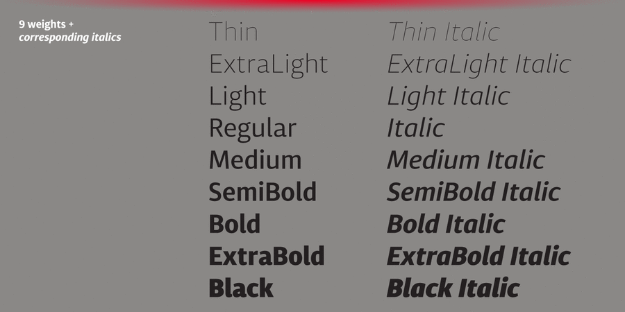 Цей сучасний гротеск розроблений як універсальна читабельна «робоча конячка» для текстів та заголовків. Досить високі рядкові знаки й статичні форми сприяють комфортному читанню, як вузьких газетних колонок, так і сторінок електронних видань.