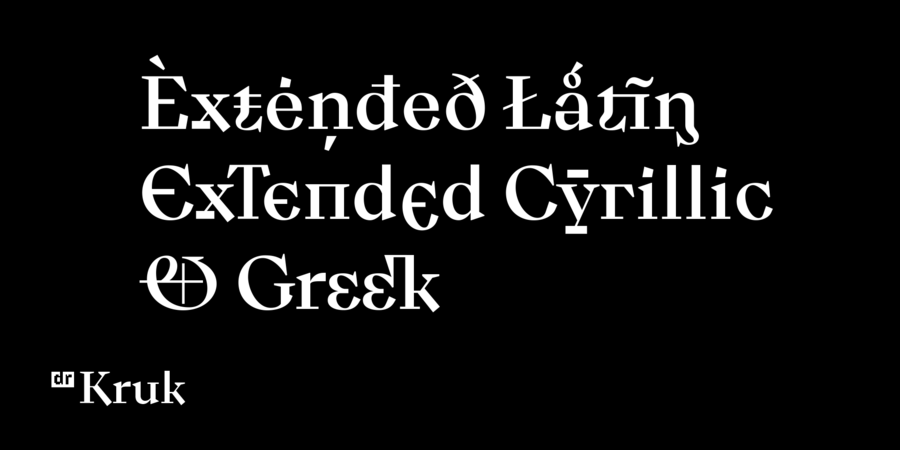 DR Kruk Single підтримує 105 мовУкраїнська, Англійська, Німецька, Польська, Португальська, Іспанська, Казахська, Французька, Грецька (сучасна), Старослов’янська, В'єтнамська, Російська, Чеська, Голландська, Італійська, Шведська, Турецька, Фінська, Білоруська, Грецька, Татарська, Сербська, Болгарська, Естонська, Литовська, Албанська, Африкаанс, Баскська, Бретонська, Валенсаска, Галісійська, Гельська (Шотландська), Данська, Індонезійська, Ірландська, Ісландська (Win), Каракалпацька, Каталонська, Норвезька, Окситанська, Ретороманська, Самі Лулі, Тсванська, Узбецька (Лат.), Фарерська, фризька, Чаморро, Естонська (Win), Південносаамська, Албанська (Win), Угорська, Верхньолужицька, Карельська, Латвійська (Mac), Литовська (Mac), Маорійські (Mac), Молдавська (Лат.), Нижньолужицька, Румунська (Win), Словацька, Словенська, Туркменська (Лат.), Хорватська (Win), Естонська (Mac), Курдська, Латишська, Маорійські, Руминська, Абазинська, Аварська, Агульська, Адигейська, Даргинську, Інгуську, Кабардино-Черкеська, Кабардинська, Карачаєво-Балкарська, Кумицька, Лакська, Лезгинська, Македонську, Мордовсько-Мокшанська, Мордовсько-Ерзянська, Ногайська, Рутульська, Табасаранська, Татська, Цахурська, Чеченська, Азербайджанська (Кир.), Башкирська, Бурятська, Дунганска, Коломацька, Киргизька, Монгольська (Кир.), Таджицька, Талиська, Тувинська, Туркменська (Кир.), Узбецька (Кир.), Уйгурська, Російська (XIX), Російська (XVIII), Російська (X–XVII) Функції сімейства шрифтів DR Kruk SingleЗастосування у макеті: