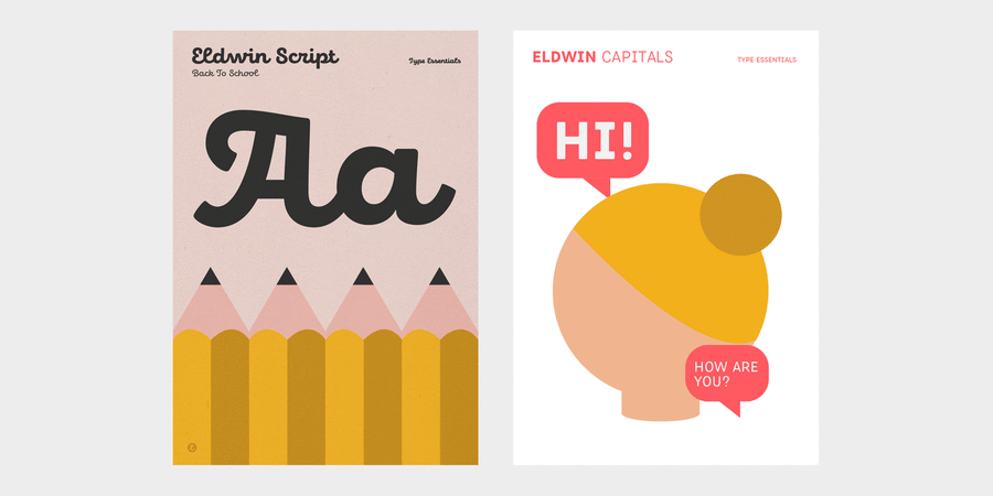 Eldwin – це енергійний з'єднаний рукописний шрифт з доброзичливим характером. Завдяки каліграфічним і гротесковим накресленням, що доповнюють одне одного, шрифт поєднує в собі грайливість і функціональність, що дозволяє йому найкращим чином працювати в таких ситуаціях, як меню і упаковка, журнали і реклама. Натхненням для Елдвіна став традиційний італійський та американський сайн пейнтінг. Розробка шрифту почалася з малюнків на папері, які потім перетворилися в цифровий шрифт. Сімейство включає 6 насиченостей у двох стилях (Script і Capitals) з латиницею і кирилицею, альтернативними гліфами та лигатурами. Шрифт розробила Ксенія Білоброва у 2017 році. Eldwin™ є торговою маркою компанії The Northern Block.