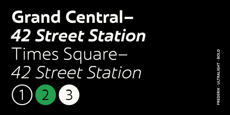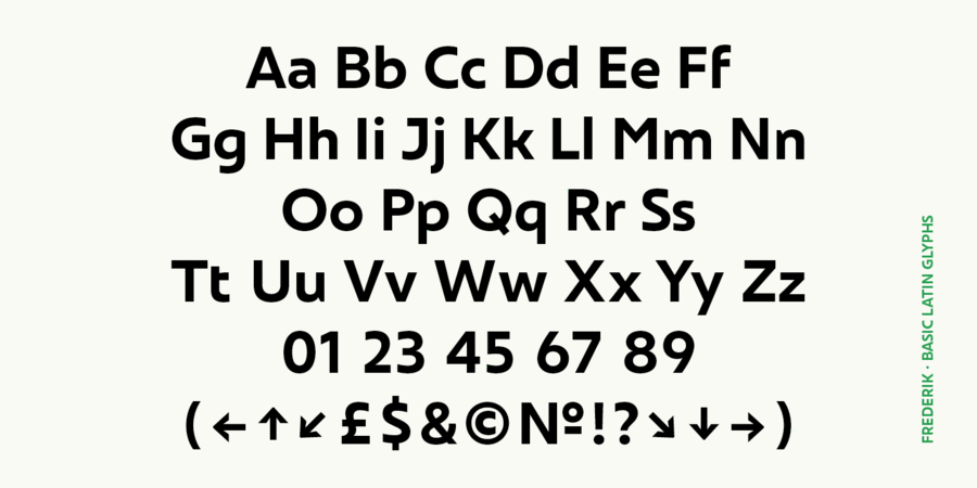 Традиційний гуманістичний гротеск у сучасній інтерпретації. Свіжий та нейтральний на вигляд, але водночас органічний та дружній. Frederik пропонує 10 накреслень від тонкого до чорного, а також відповідні курсиви. Звичайний і середня вага відмінно підходять для дрібного основного тексту, а Light і Heavy найкраще підходять для демонстраційних цілей, що робить Frederik універсальним шрифтовим сімейством для широкого застосування. Функції Opentype включають нижні й верхні індекси, дроби, цифри в колах, лігатури, численні стрілки, включно зі збільшеною довжиною, а також підтримку всіх латинських і кириличних мов. Frederik™ є торговою маркою компанії The Northern Block. Шрифт розробила Ксенія Білоброва у 2019 році.