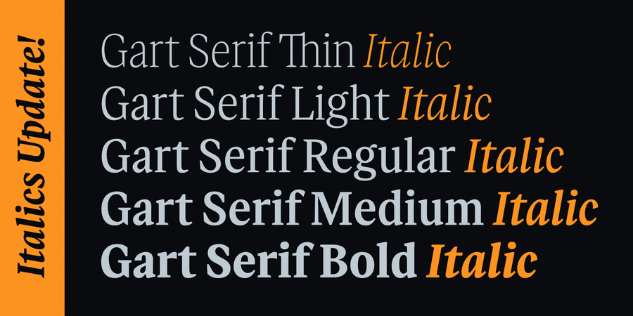 Gart Serif — шрифт з засічками, в якому традиції перехідних антикв 18-го століття поєднуються з сучасними рішеннями. Порівняно з іншими антиквами, Gart Serif вирізняється своїми вузькими пропорціями, виразним контрастом та легкою покатістю овалів, що підсилюють його характер, водночас не заважаючи зручності читання. Gart Serif — це ідеальна шрифтова пара для Gart Sans.