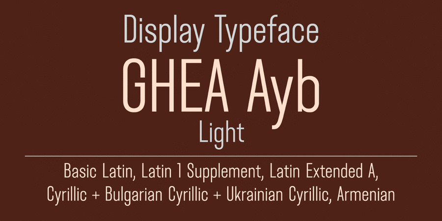 Цей вузький акцидентний гротеск може використовуватися в назвах, заголовках і коротких текстах. Ayb підтримує розширену латинку, кирилицю, включно з українськими та болгарськими варіантами літер, а також вірменську абетку. Шрифт розробив Едік Габузян у 2020 році.