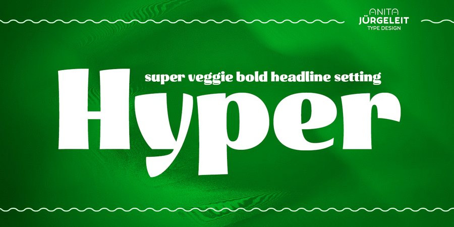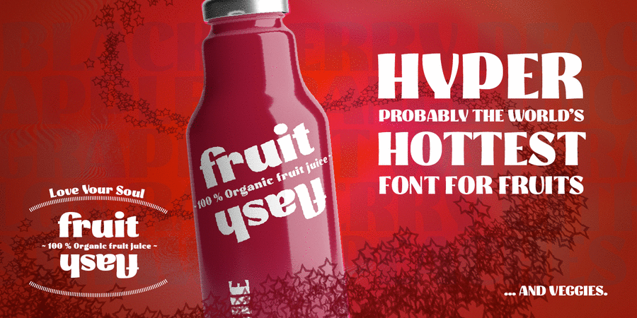 Hyper – це максимально заголовковий шрифт для фруктів, овочів, квітів та усіх красивих і здорових речей, які наповнюють ваше життя радістю і задоволенням. Hyper найкраще виглядає на великих і навіть величезних розмірах. Тому, для тонкої настройки дизайну, Hyper відображається у двох основних накресленнях: Hyper Black створений для заголовків, логотипів. Hyper Grande зроблений для дуже великих написів на плакатах або великих банерах. Воно має трохи більше елегантності за рахунок тонших горизонтальних штрихів. Добре сформовані літери Hyper римуються одна з одною та ніби тримаються за руки.
