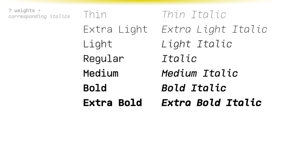 Моноширинна екранна гарнітура, натхненна старими відеомагнітофонами та камерами, шрифтами їх екранних інтерфейсів. Цей шрифт відрізняється своїми діагоналями, кути яких обмежені 45°, що дає специфічну текстуру та ідеальну читабельність у дрібних розмірах. Гарнітура має 7 накреслень різної насиченості з відповідними курсивними версіями. Кожне анкреслення містить понад 500 ґліфів для підтримки безлічі мов, включно з кирилицею. Шрифт розробив Андрій Константинов в студії Mint Type у 2020 році.