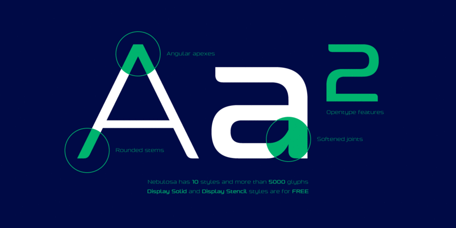 Це футуристичний, трохи розширений гротеск з півкруглими закінченнями, які надають пом'якшений естетичний вигляд, не порушуючи солідності. Nebulosa найкраще підходить для логотипів, заголовків і елементів екранного інтерфейсу, а також для текстових блоків невеликої довжини. Гарнітура складається з 10 накреслень, 8 з яких містять знаки мов на латинці та кирилиці, капітель, лігатури. Інші 2 накреслення безкоштовні для використання на умовах десктоп-ліцензії. Шрифт розробив Пабло Балселлс у 2020 році.