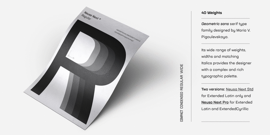 Neusa Next Pro – це сімейство геометричних гротесків з широким діапазоном насиченості й ширини. Гарнітура надає дизайнерові складну й багату типографічну палітру. Розроблений та випущений як Neusa в 2012 році, проект задумувався як компактне шрифтовое сімейство. Прийнятний для тексту, шрифт мав відмітні характеристики, які дозволяли йому також працювати в акціденціі. Сьогодні Neusa Next Pro розширює набір символів до розширеної кирилиці та включає ще три ширини: вузьку, звичайну та широку, кожен з наборів накреслень має свій індивідуальний характер. На такий дизайн надихнули ранні дослідження космосу, в тому числі культова обкладинка журналу «Life» 1969 на тему програми Apollo та, звичайно, твори швейцарських дизайнерів. Сімейство Neusa Next Pro складається з 20 ваг, по п'ять жирностей на кожну ширину, з відповідними курсивами, всього 40 накреслень. Можливості OpenType включають локалізовані форми для башкирської, болгарської, каталонської, чуваської, голландської, македонської, молдавської, румунської та сербської мов, а також верхні й нижні дроби, пунктуацію з урахуванням регістру та спеціальний стилістичний набір з іконками космічної тематики. Мовна підтримка включає латинські та кириличні алфавіти більшості західноєвропейських і центральноєвропейських мов, заснованих на латинці. Шрифт розробила Марія Пігулевська у 2017 році. Neusa Pro™ є торговою маркою компанії The Northern Block.