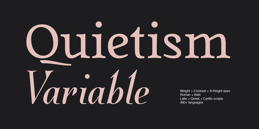 Quietism Variable – варіативна гарнітура з трьома осями: Weight (Thin – Black), Contrast (Low – High), та X-Height (Low – High).