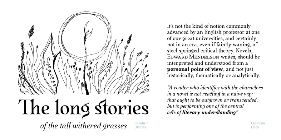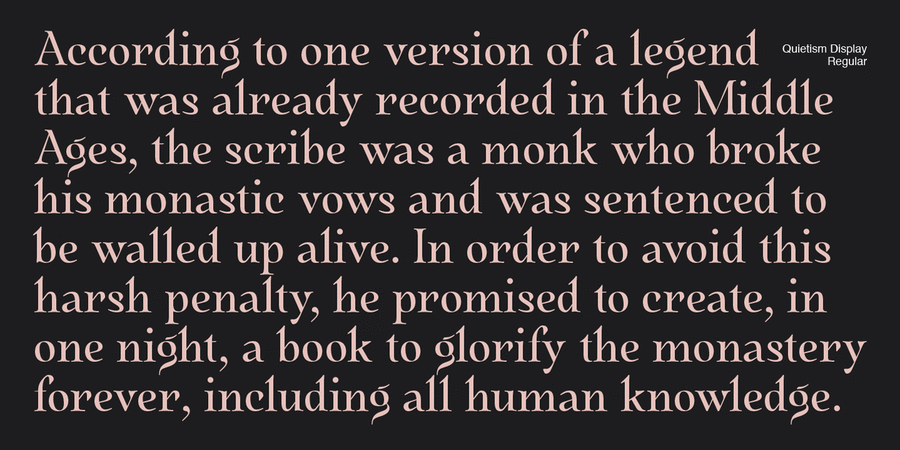 Quietism – це м'яка споглядальна антиква зі спрямованими до неба верхніми виносними елементами, натхненна філософією квієтизму. Ясність розуму досягається за рахунок приведення тіла в стан спокою і споглядання, і це відображено в дизайні – м'які спокійні горизонтальні засічки (тіло) протиставлені гострим верхнім виносним елементам (розум). Особливостями дизайну є чотири підродини різних оптичних розмірів з різною висотою рядкових і контрастністю, діагональний стресс старого стилю, цифри старого стилю за замовчуванням, гладкі деталі та дещо затемну текстуру.