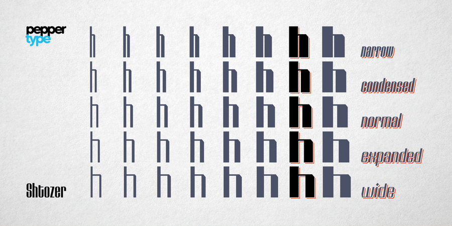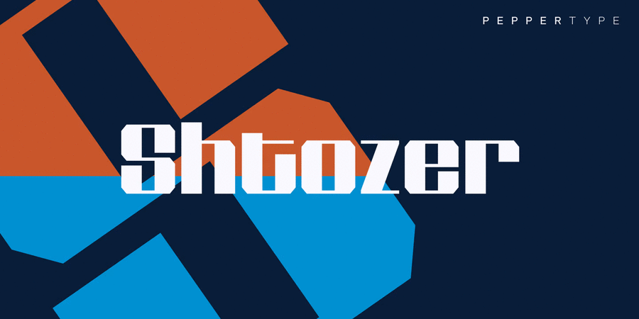 Висококонтрастна версія шрифту Штозер. Акцидентний шрифт у стилі ретро, створений за мотивами 1960-х і 1970-х років, додатково натхненний кириличної в'яззю. Він поставляється у 8 насиченостях, з 5 варіантами ширини для кожної, все супроводжуються відповідними нахиленими версіями – в цілому 80 накреслень. Shtozer – шрифтове сімейство з широким мовним охопленням, що включає кирилицю. Гарнітура також містить безліч функцій OpenType і альтернативних ґліфів для пожвавлення набору. Шрифт розробив Олег Ліщук у 2020 році.