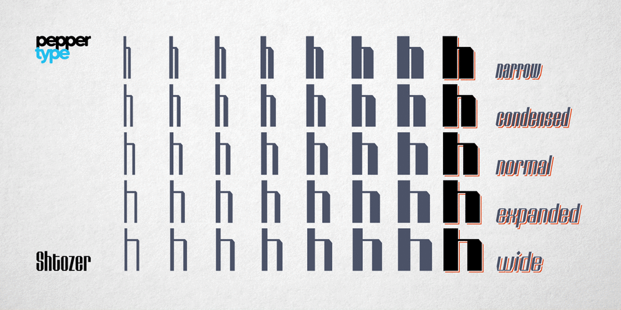 Максимально контрастна версія шрифту Штозер. Акцидентний шрифт у стилі ретро, створений за мотивами 1960-х і 1970-х років, додатково натхненний кириличної в'яззю. Він поставляється у 8 насиченостях, з 5 варіантами ширини для кожної, все супроводжуються відповідними нахиленими версіями – в цілому 80 накреслень. Shtozer – шрифтове сімейство з широким мовним охопленням, що включає кирилицю. Гарнітура також містить безліч функцій OpenType і альтернативних ґліфів для пожвавлення набору. Шрифт розробив Олег Ліщук у 2020 році.
