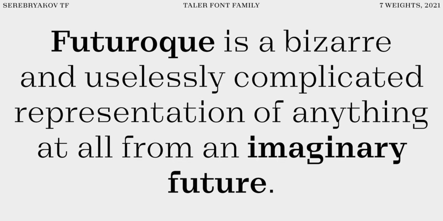 Талер – це сучасна антиква у семи накресленнях. Гарнітура була задумана як доповнення до гротеску Nekst. У процесі розробки з'ясувалося, що виходить зовсім інший шрифт. Прямокутні, трохи подовжені зарубки, пластична жорсткість та поєднання різних стилів роблять Taler справжнім представником сучасності. Він призначений для акциденції та для основного тексту, водночас старомодний та сучасний, грубий та елегантний – всі ці якості присутні у шрифті одночасно. Його головна особливість – двоїстість. Шрифт розробив Денис Серебряков у 2021 році.